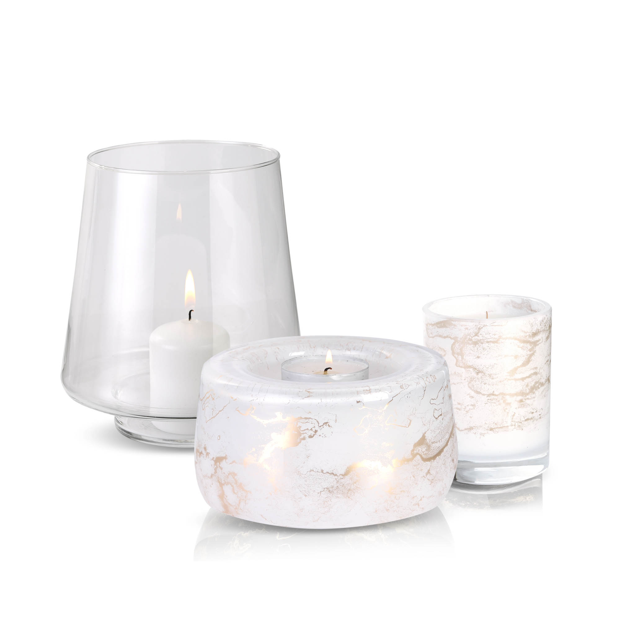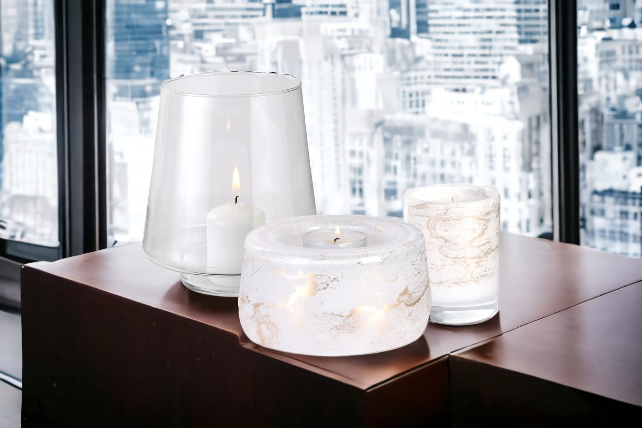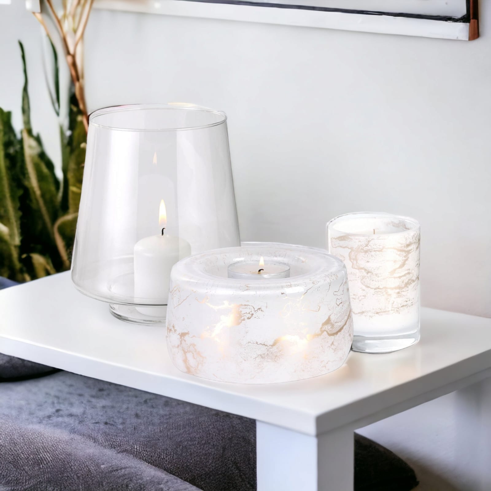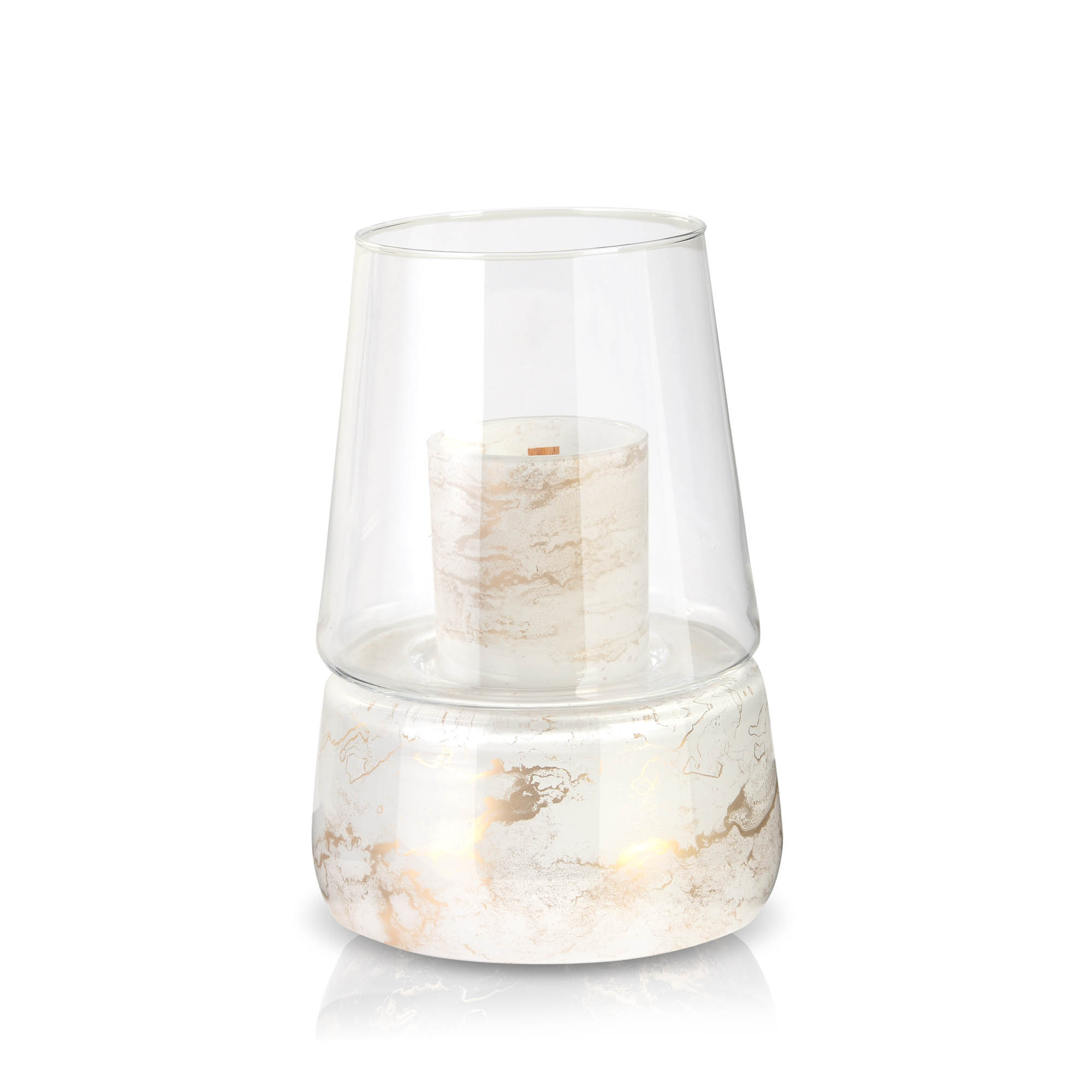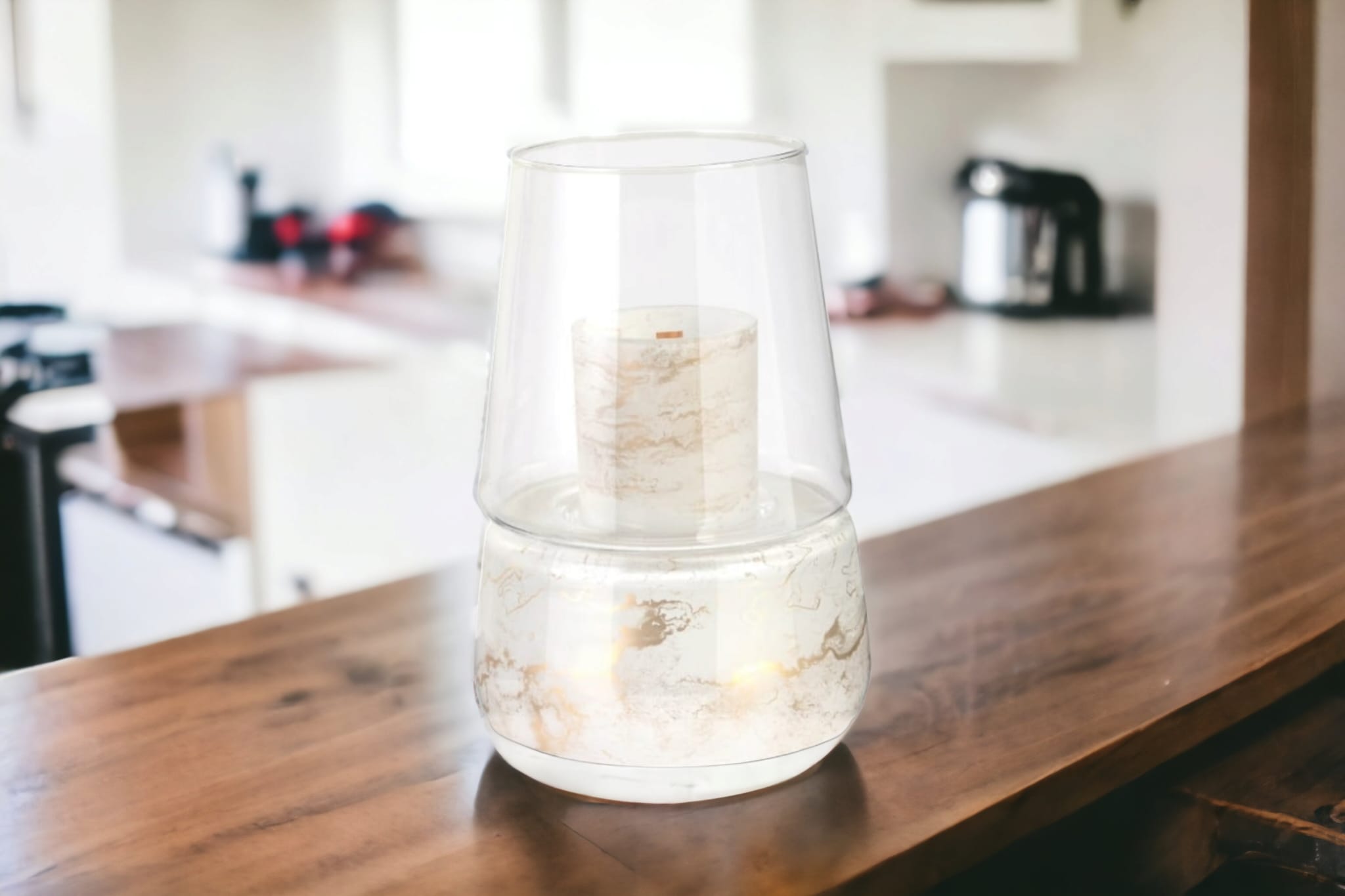 Wyjątkowy lampion marki VanderGroff w delikatne bieli ze złotym marmuerem, który wnosi do wnętrza blask i elegancję. Jego delikatny wygląd doskonale wpasowuje się w różne style wnętrzarskie, od skandynawskiego po boho. Idealny do wnętrz i przestrzeni zewnętrznych, tworząc ciepły, kojący klimat. Perfekcyjny wybór na wieczorne chwile relaksu lub wyjątkowe okazje w gronie bliskich. Wkład zawiera 200 g wysokiej jakości wosku zapachowego o wyjątkowym aromacie perfum SummerShine by VanderGroff. Ten luksusowy zapach wprowadzi do Twojego wnętrza niesamowitą aurę pełną świeżości i elegancji, idealną do stworzenia przytulnej i relaksującej atmosfery.