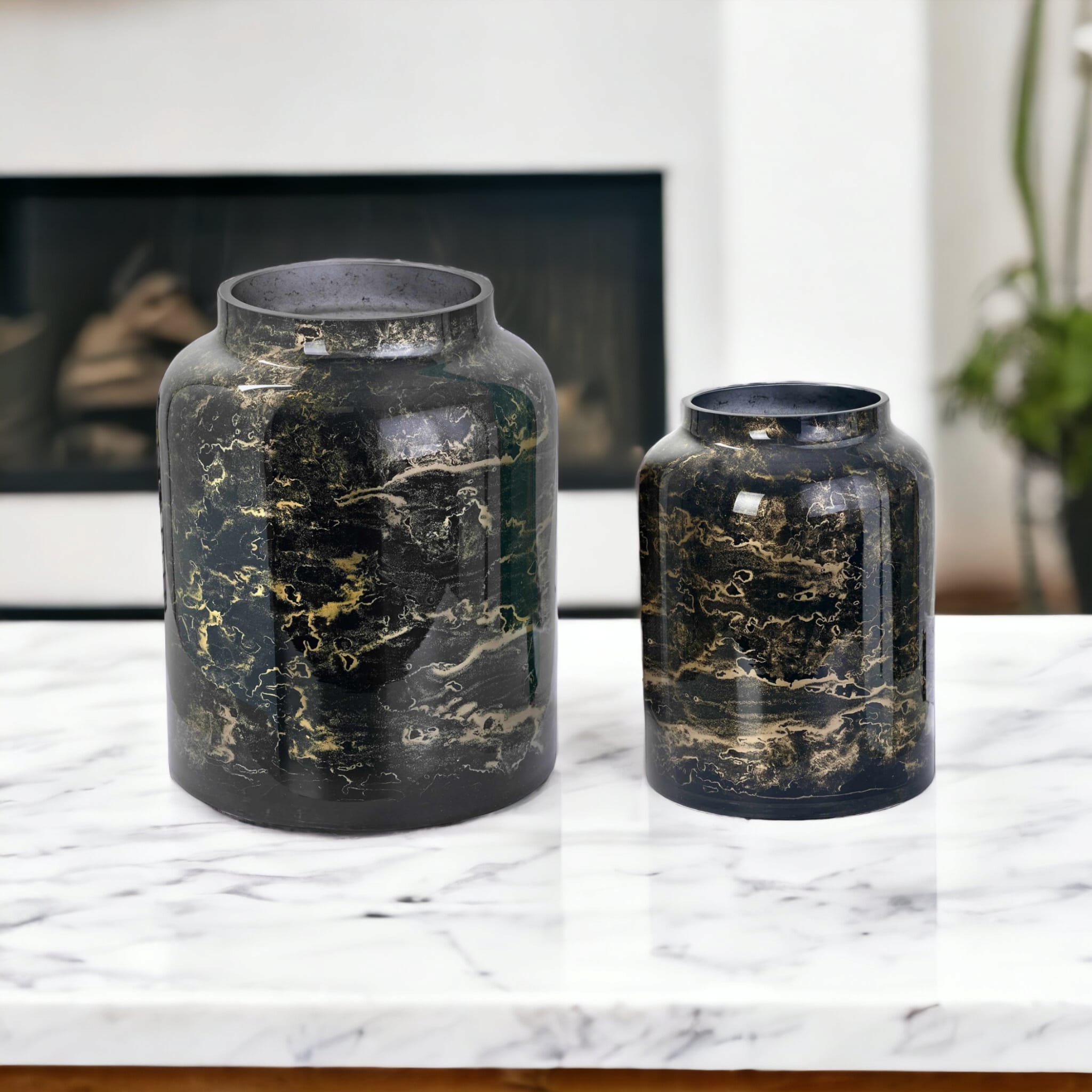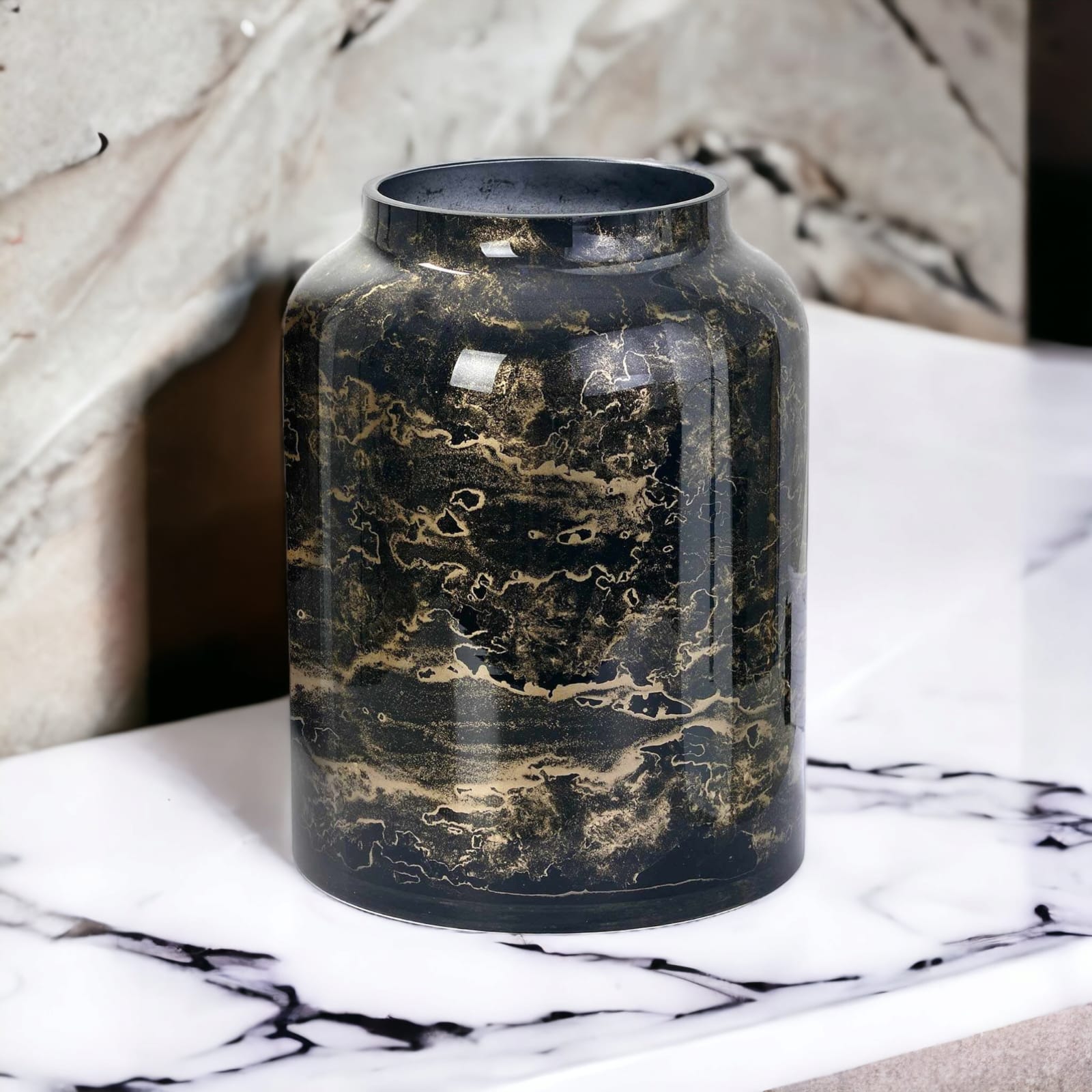 🌑 Złoty marmurowy wzór – delikatne, złote żyłki marmuru wiją się po całej powierzchni, nadając wazonowi luksusowego charakteru i finezyjnej lekkości..