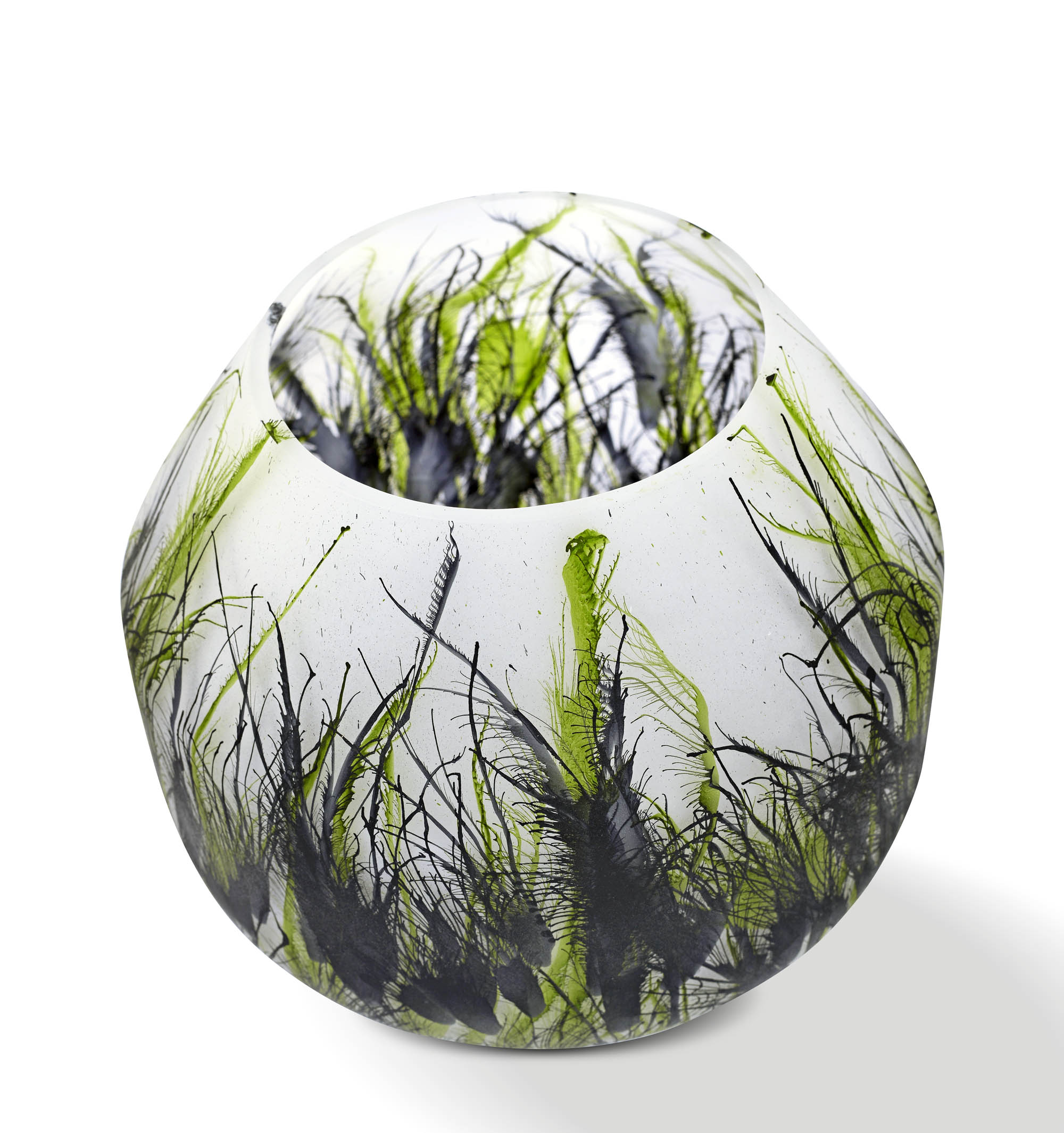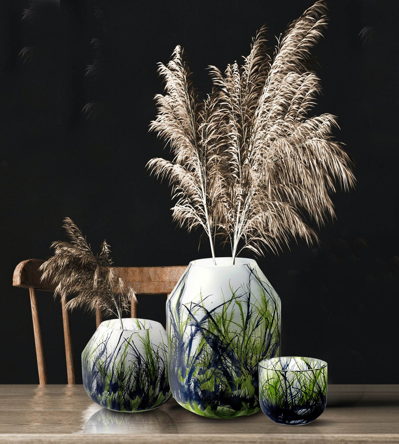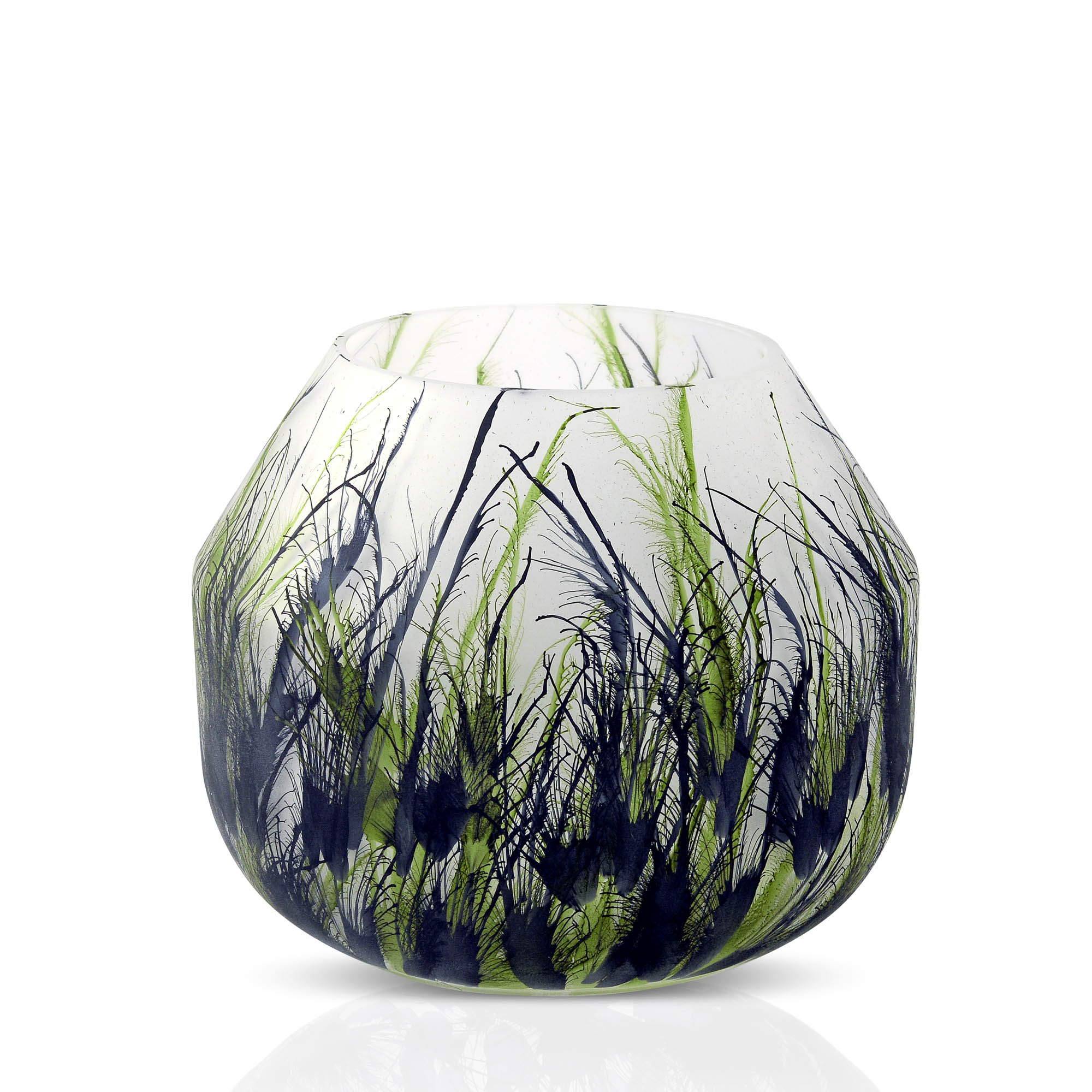 Szklany wazon marki VanderGroff – VG22/Natura został wykonany z wysokiej jakości szkła i zdobiony ręcznie, inspirowany brawami natury. Jego wyjątkowo zielono-czarne zdobienie w połączeniu z jedwabistym matowym kolorem tworzy niezwykle efektowną kompozycję, która przyciąga wzrok i stanowi elegancki akcent w każdym pomieszczeniu.