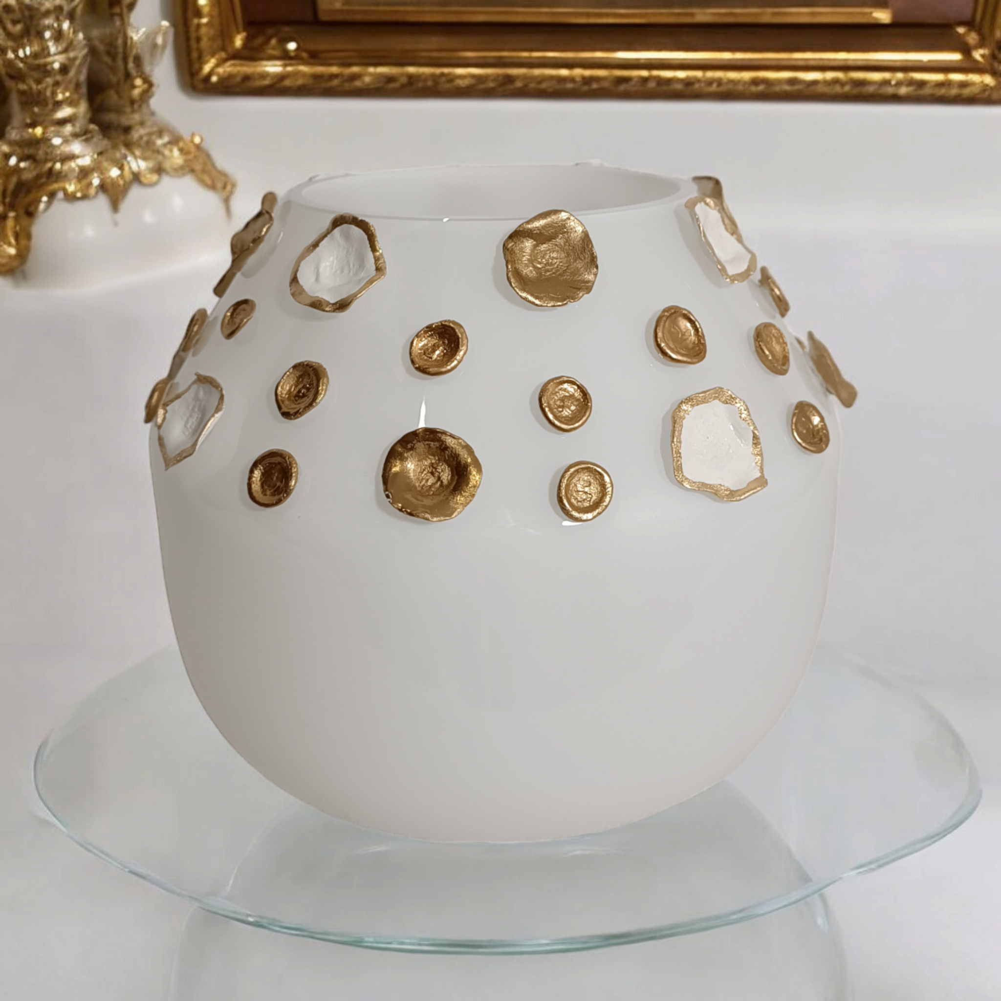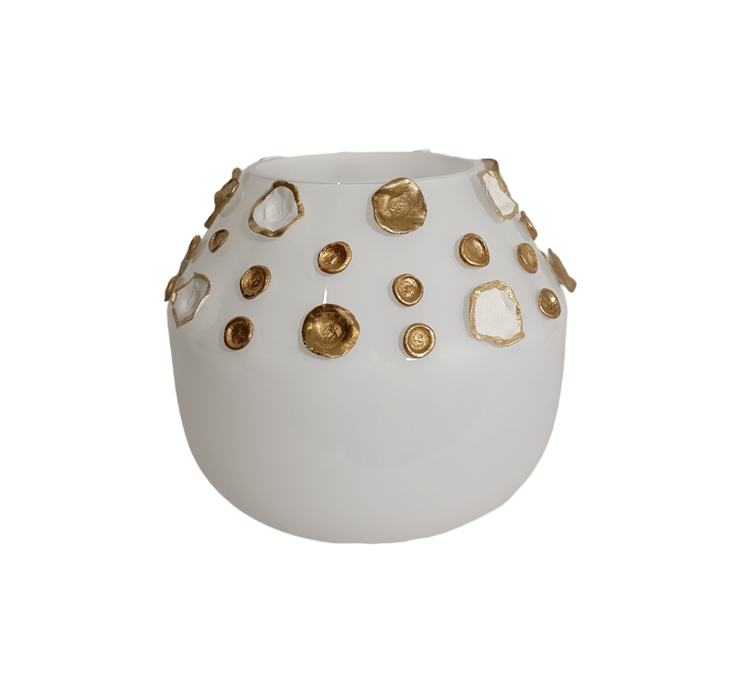 Szklany wazon marki VanderGroff – VG22W/DWG z serii Exclusive White to elegancki i stylowy dodatek, który doskonale uzupełni każde wnętrze. Jego bogaty biało-złoty design i perfekcyjne wykonanie podkreślają wyjątkowy charakter tej kolekcji.