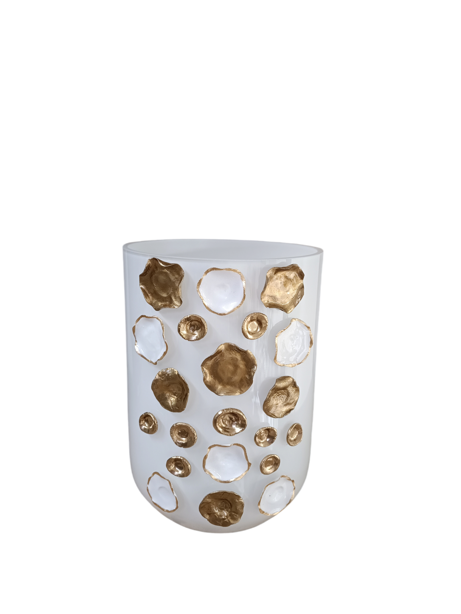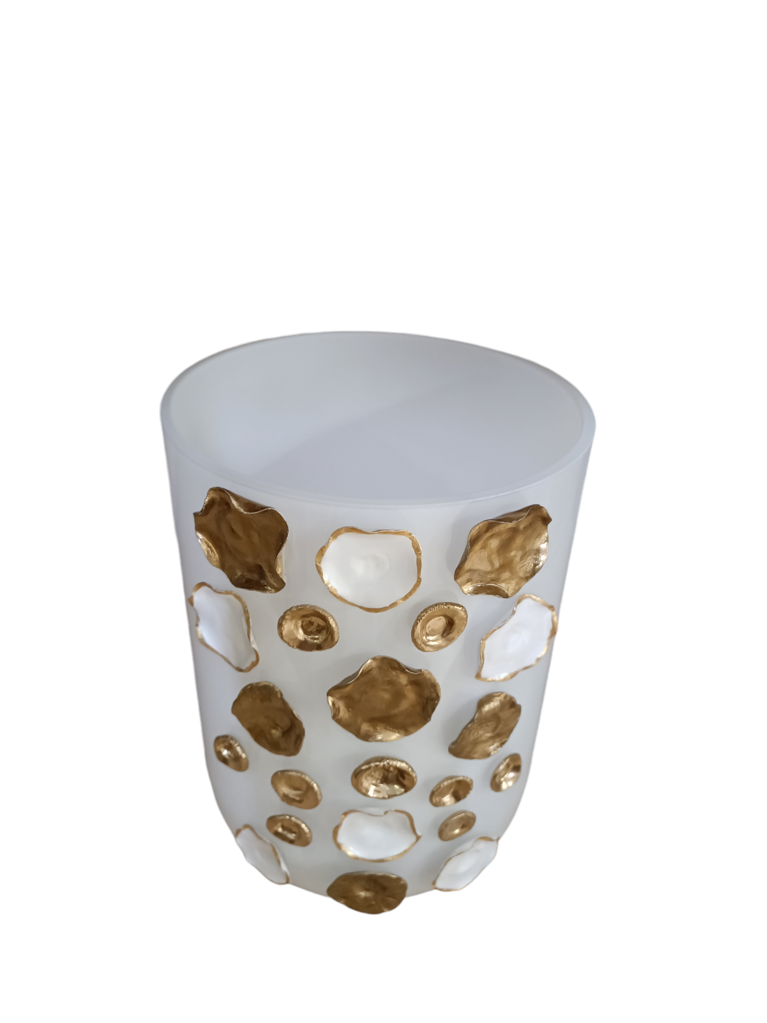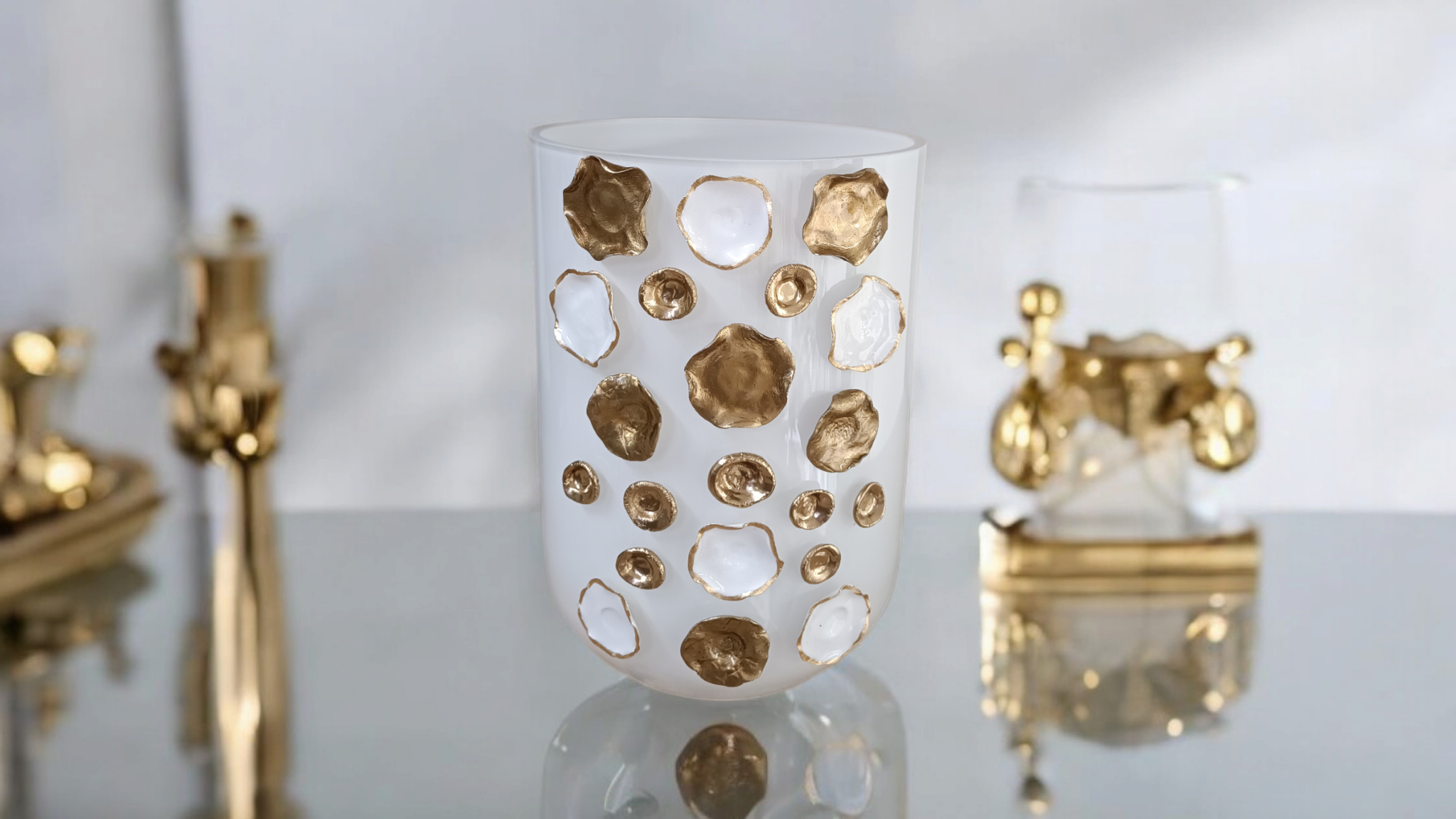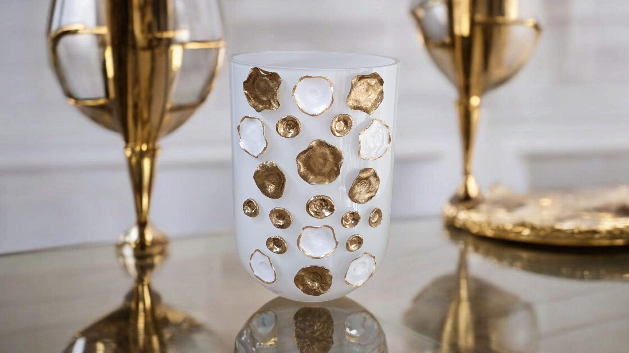 Szklany wazon marki VanderGroff – VG24B/DBG z serii Exclusive White to elegancki i stylowy dodatek, który doskonale uzupełni każde wnętrze. Jego bogaty biało-złoty design i perfekcyjne wykonanie podkreślają wyjątkowy charakter tej kolekcji.