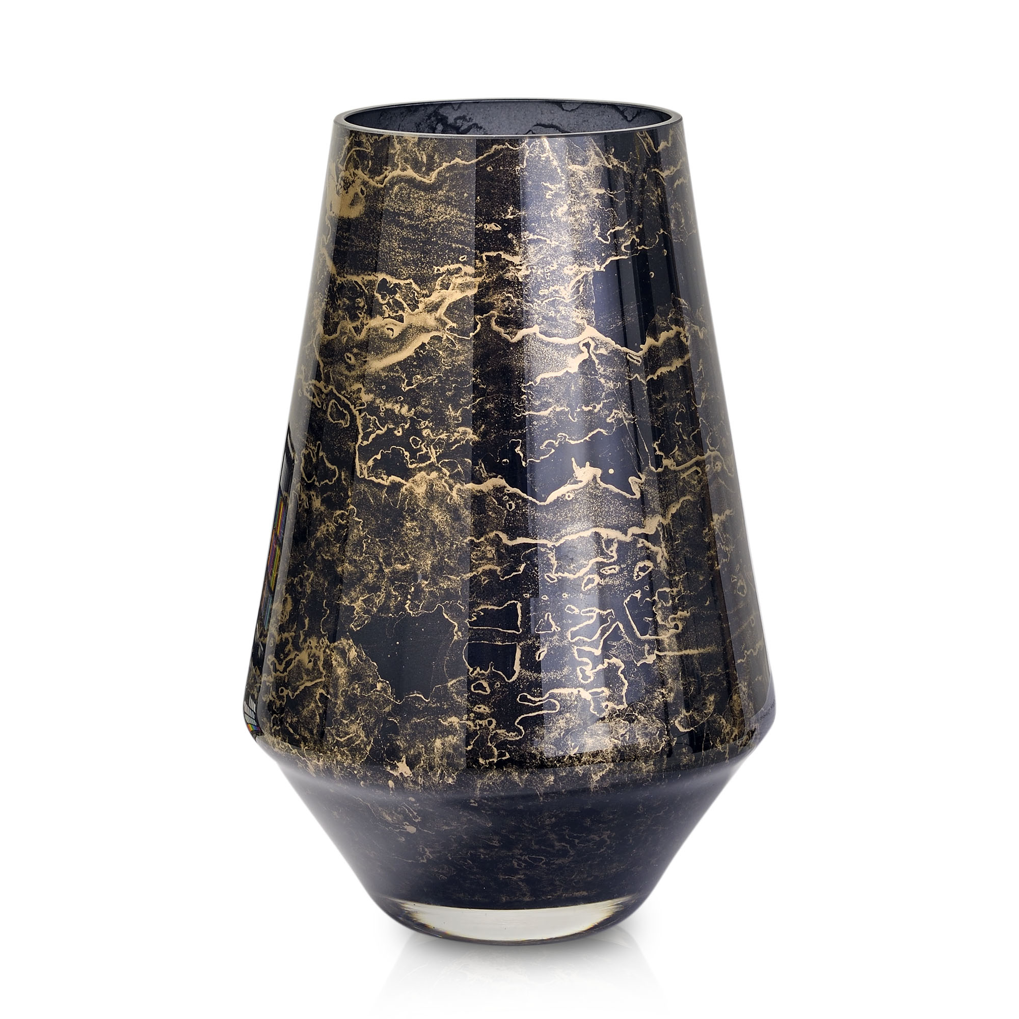Wazon VG27 Diament/Black to połączenie nowoczesnego designu i klasycznej elegancji, które doskonale wpisuje się w różnorodne wnętrza. Jego smukła forma, wykonana z wysokiej jakości szkła, nadaje wnętrzu subtelnego, a zarazem luksusowego charakteru. Głęboka czerń wazonu w połączeniu ze złotym marmurowym wzorem tworzy efekt, który przyciąga wzrok i wprowadza do przestrzeni wyjątkowy klimat.