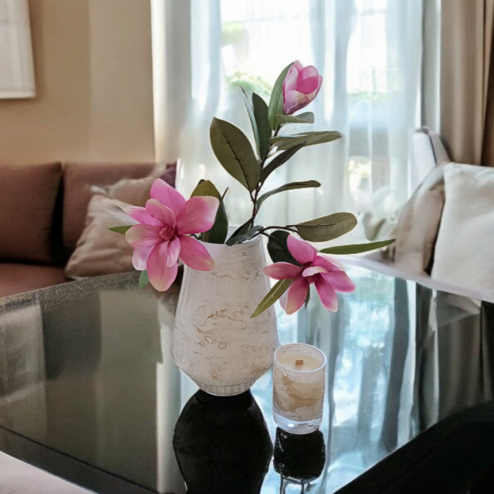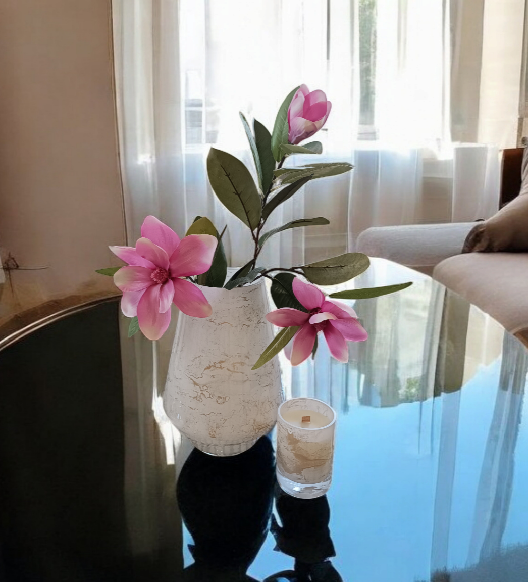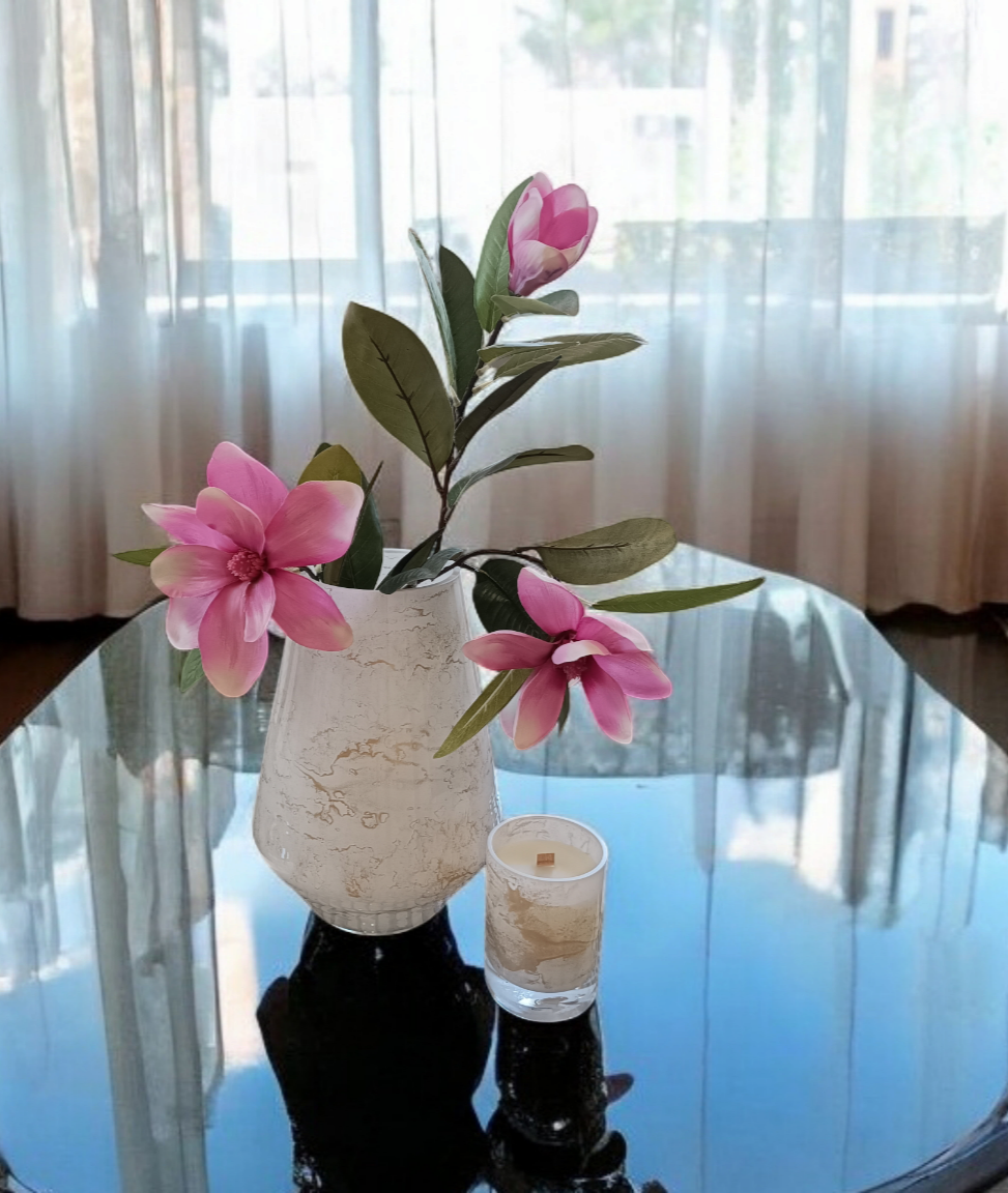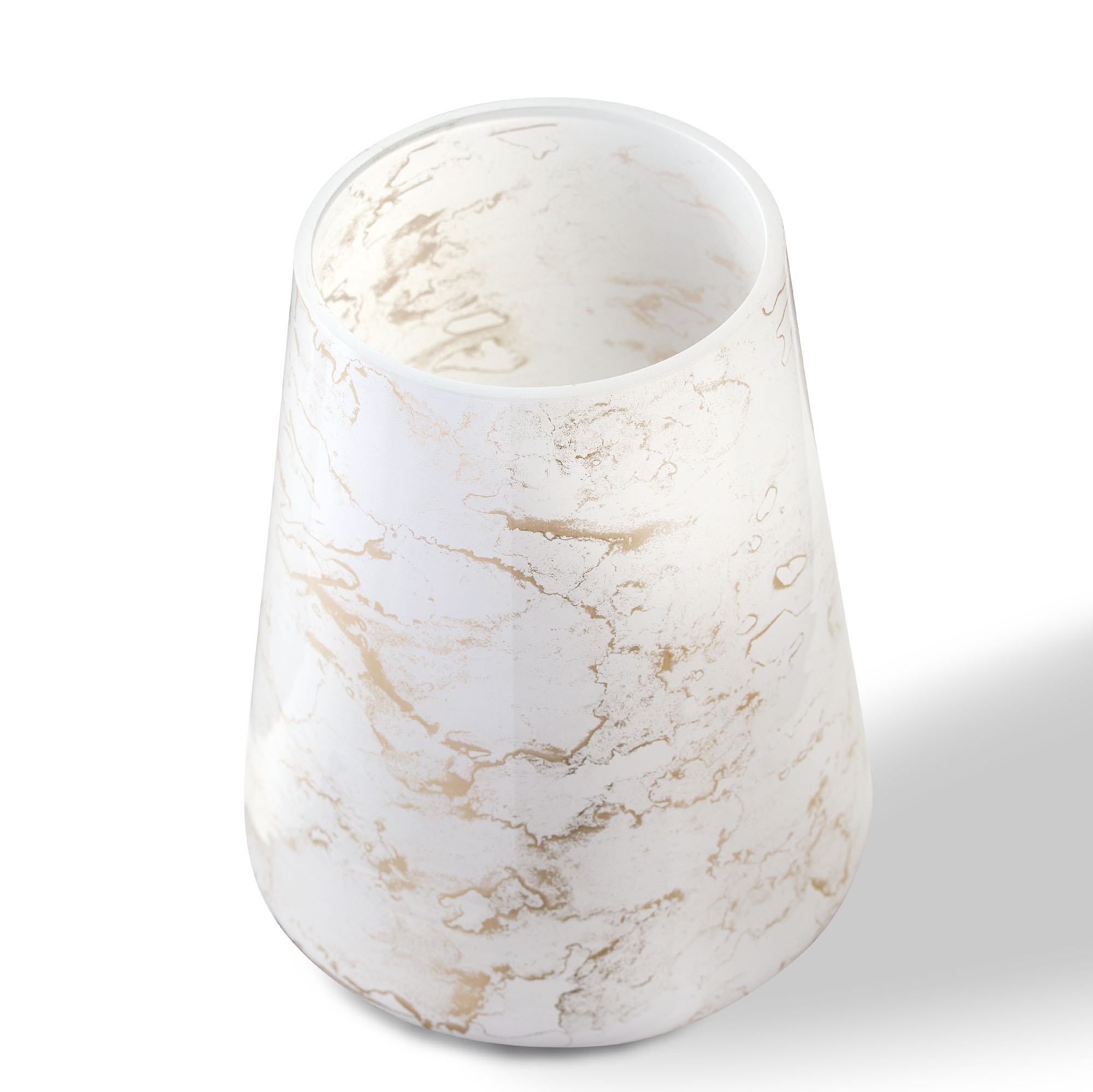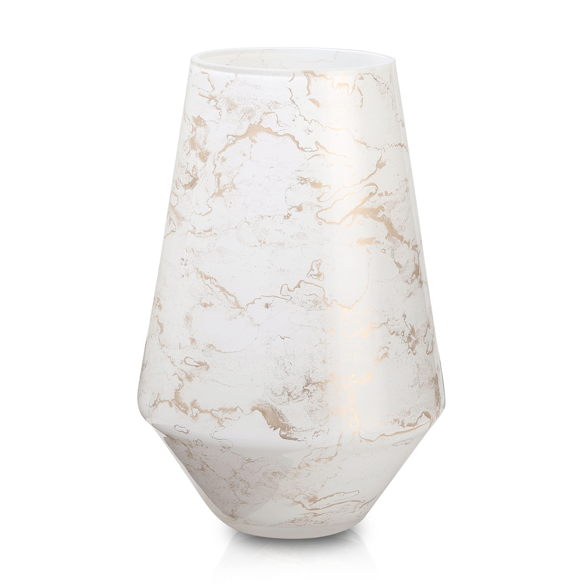 Szklany wazon marki VanderGroff – VG27 Diament/White został wykonany z wysokiej jakości szkła i dekorowany ręcznie z niezwykłą precyzją w delikatne bieli ze złotym marmurem, który wnosi do wnętrza blask i elegancję. Jego delikatny wygląd doskonale wpasowuje się w różne style wnętrzarskie, od skandynawskiego po boho. Idealny do wnętrz i przestrzeni zewnętrznych, tworząc ciepły, kojący klimat.