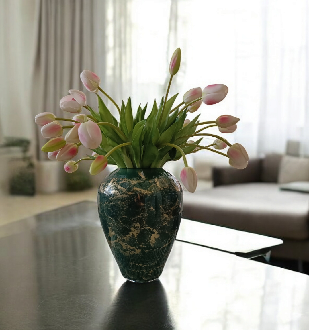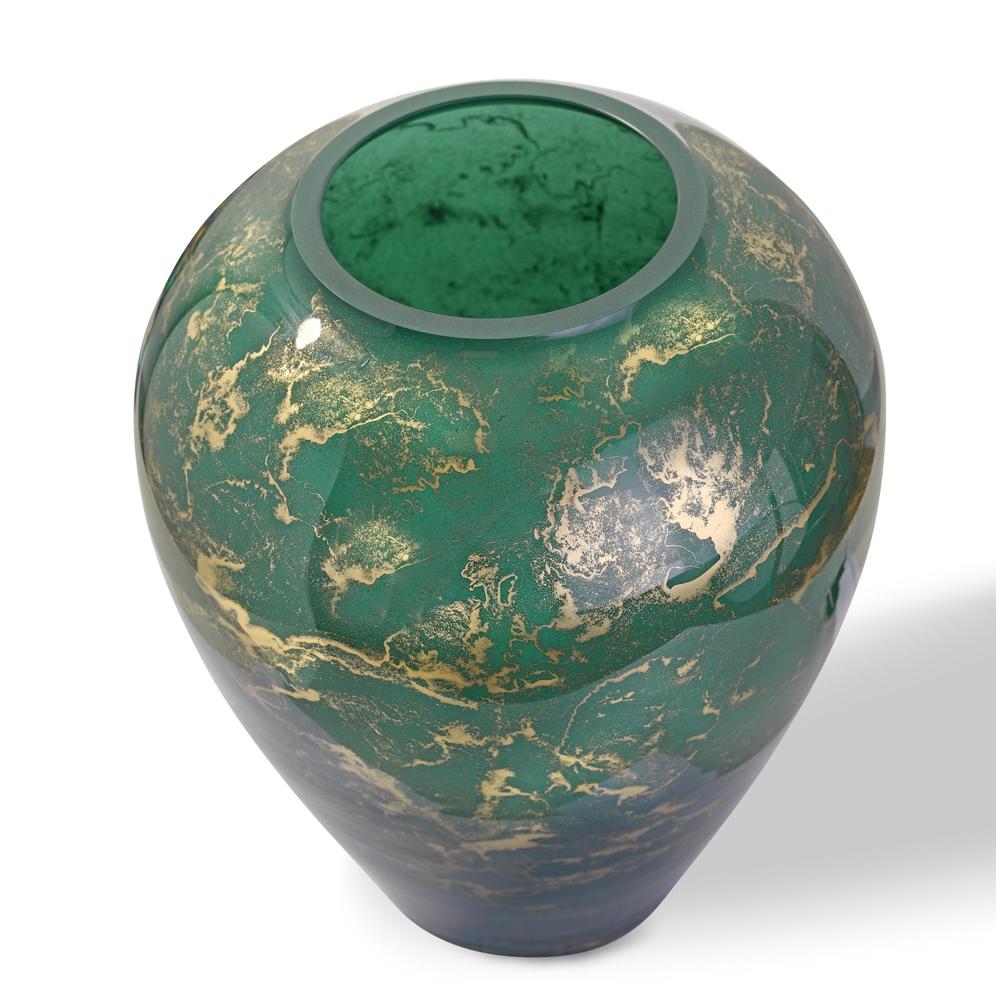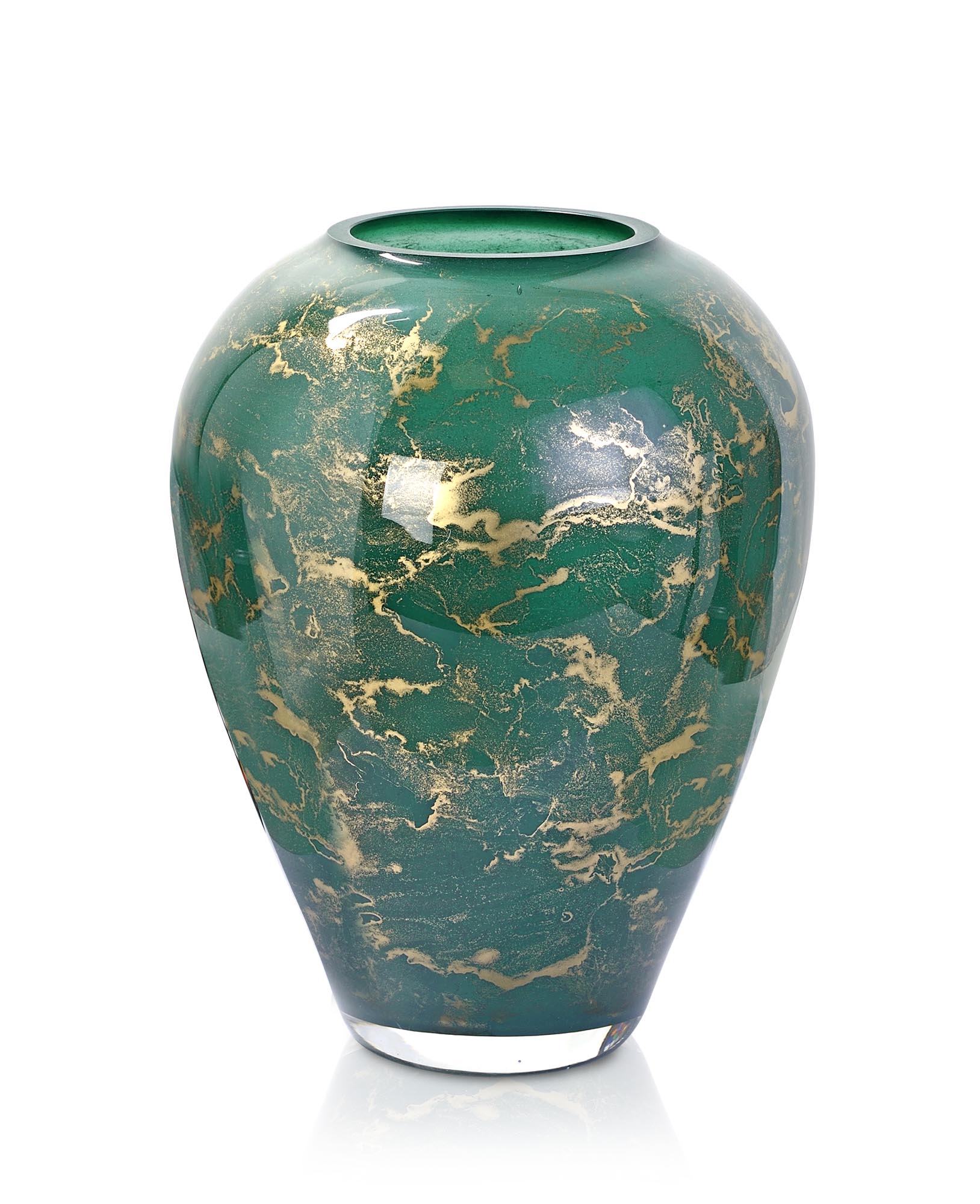 Szklany wazon marki VanderGroff – VG27/Green został wykonany z wysokiej jakości szkła i dekorowany ręcznie z niezwykłą precyzją. Wyjątkowy kolor butelkowej zieleni z dodatkiem złotego marmuru nadaje mu luksusu i elegancji. Ten wazon stanowi dodatek jak do nowoczesnych tak i do tradycyjnych wnętrz.