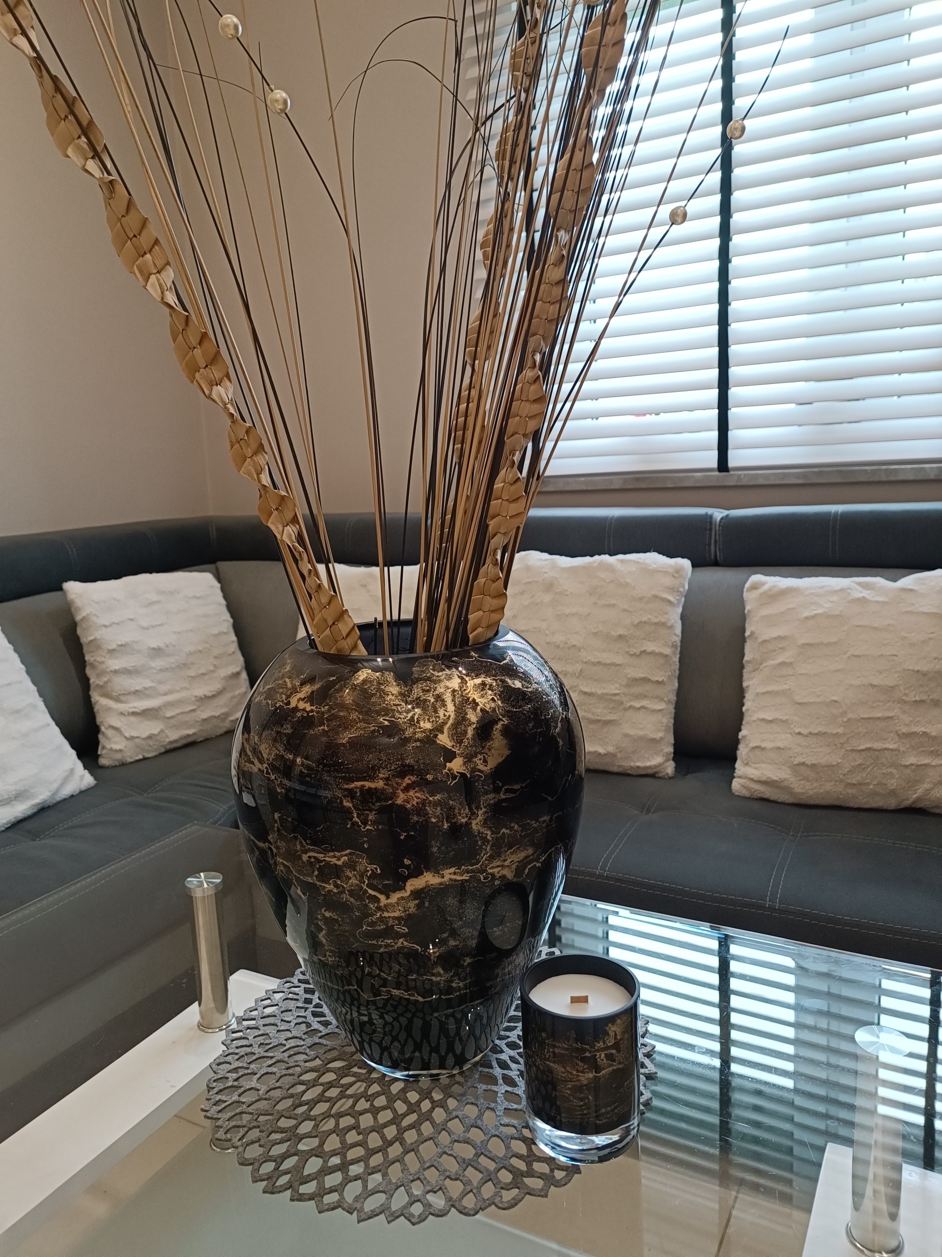 • Intensywny czarny kolor: Jego głęboka czerń nadaje wazonowi nowoczesny wygląd, który w połączeniu z subtelnym złotym wzorem staje się eleganckim akcentem w każdym wnętrzu.