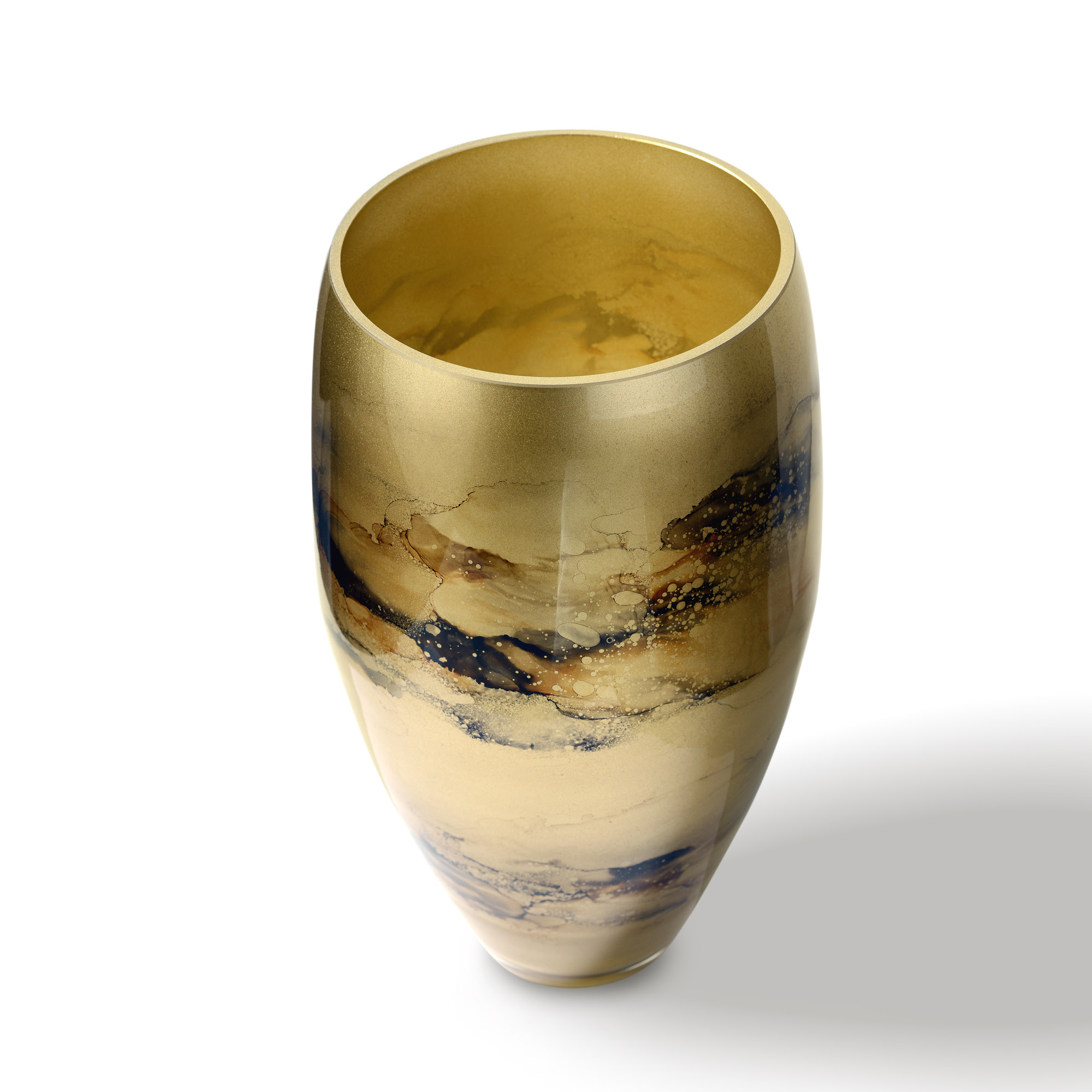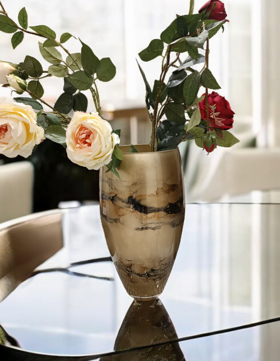 Szklany wazon marki VanderGroff – VG38/GOLD został wykonany z wysokiej jakości szkła i dekorowany ręcznie z niezwykłą precyzją. Złoty kolor w połączeniu z eleganckimi, ciemnymi marmurowymi wzorami nadają mu luksusowy charakter i elegancję. Idealnie sprawdzi się jako stylowy dodatek do wnętrz, wnosząc nutę klasy i prestiżu zarówno w nowoczesnych, jak i tradycyjnych aranżacjach.