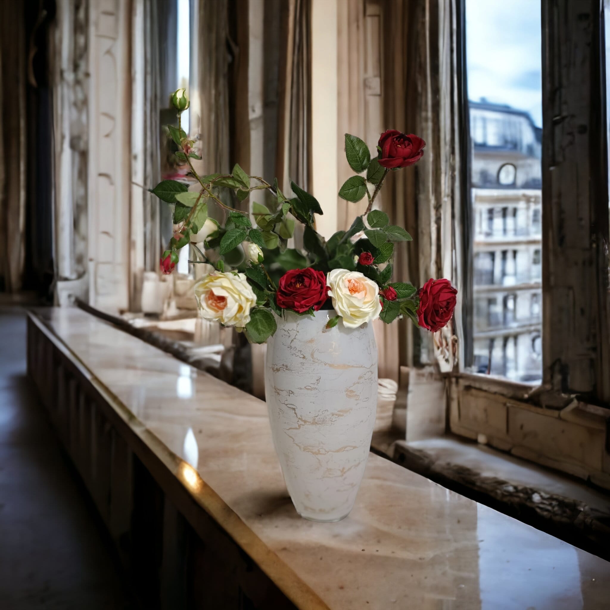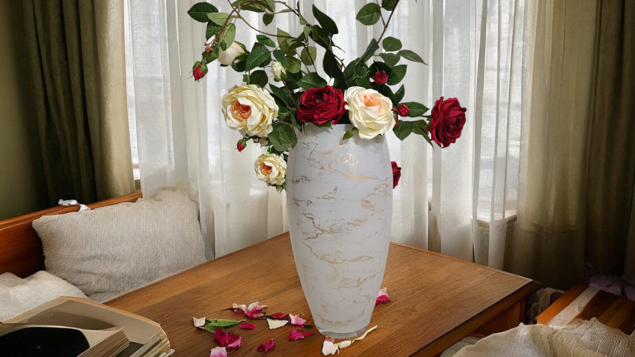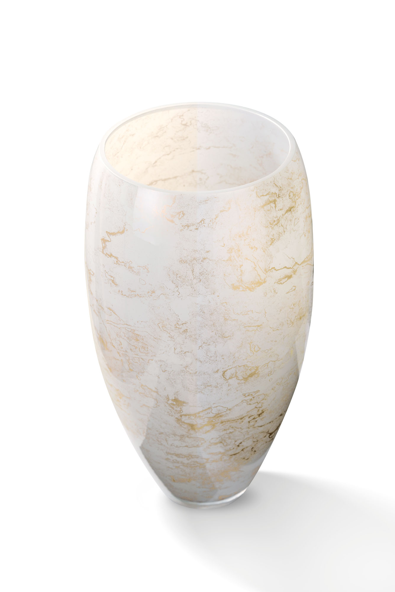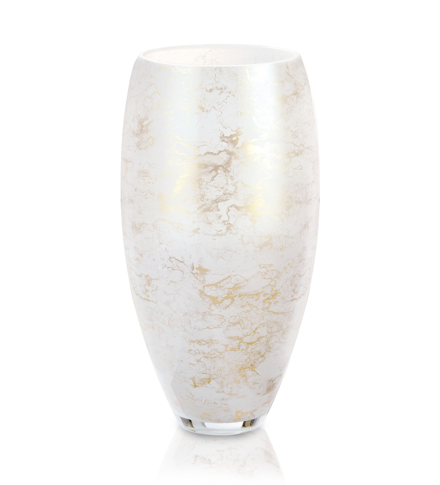 Duży szklany wazon marki VanderGroff – VG38/White został wykonany z wysokiej jakości szkła i dekorowany ręcznie z niezwykłą precyzją w delikatne bieli ze złotym marmurem, który wnosi do wnętrza blask i elegancję. Jego delikatny wygląd doskonale wpasowuje się w różne style wnętrzarskie, od skandynawskiego po boho. Idealny do wnętrz i przestrzeni zewnętrznych, tworząc ciepły, kojący klimat.